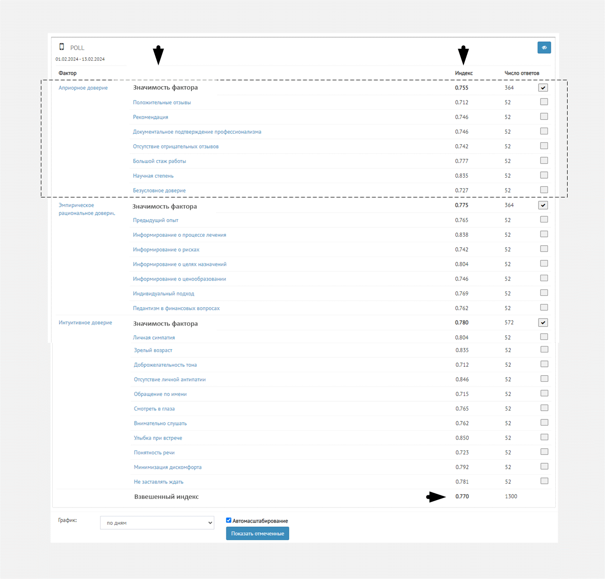 Вы получаете список факторов и субфакторов, влияющих на доверие, с количественными оценками их важности для ваших пациентов.