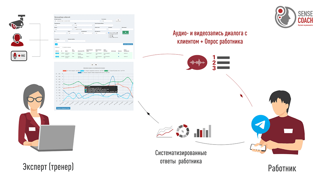 - SenseCoach отвечает на вопрос: «КАК сделать так, чтобы каждый сотрудник стабильно делал именно то, что нужно?». Ответ через коучинг и контроль качества.