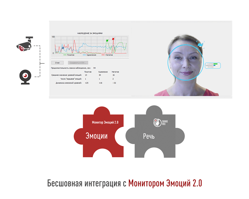 Монитор Эмоций 2.0 автоматически отслеживает уровни позитива, удивления и негатива, фиксирует «взрывы» эмоций, динамику изменения эмоций и другие важные показатели. Данные предоставляются в удобном интерфейсе и с возможностью экспорта в режиме реального времени в SenseRec и другие системы.