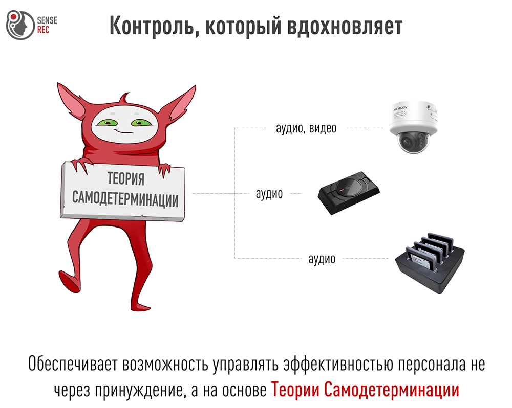 SenseRec — единственное на российском рынке решение, которое организует аудио- и видеозапись так, чтобы вы могли управлять эффективностью персонала не через принуждение, а на основе Теории Самодетерминации Райана-Деси (self-determination theory; SDT).