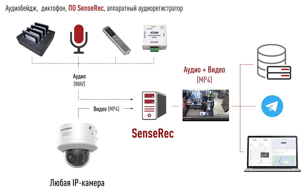 Система автоматически синхронизирует аудио- и видеоданные по временным меткам, формируя единый мультимедийный отчёт. В качестве источников Аудио поддерживаются аудиобейджи ОКТАВА, диктофоны Ritmix, ПО SenseRec, аппаратные регистраторы ICON и другие устройства. В качестве источников Видео могут использоваться практически любые IP-камеры, совместимые с ПО SenseRec.