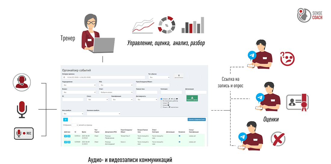 Результат этапа: Формируется не только эталон качества разговора, но и эталон качества обратной связи. Тренер получает исчерпывающие данные для индивидуальной работы.
